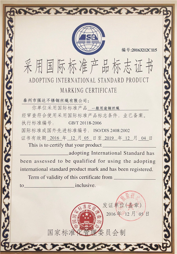泰州市強(qiáng)達(dá)不銹鋼絲繩有限公司位于江蘇興化市戴南經(jīng)濟(jì)開發(fā)區(qū),公司致力于不銹鋼絲繩產(chǎn)品生產(chǎn),立志成為“國(guó)內(nèi)技術(shù)標(biāo)桿型吊索具生產(chǎn)企業(yè)”。以此戰(zhàn)略思想指導(dǎo),公司堅(jiān)決貫徹“質(zhì)量贏市場(chǎng),管理增效益,誠(chéng)信贏天下”的質(zhì)量方針。以完善的服務(wù)在國(guó)內(nèi)不銹鋼絲繩市場(chǎng)樹立良好的品牌形象。公司榮獲“江蘇省質(zhì)量信得過(guò)企業(yè)。     靈活的管理機(jī)制,經(jīng)驗(yàn)豐富的
